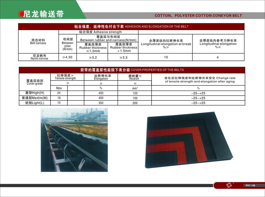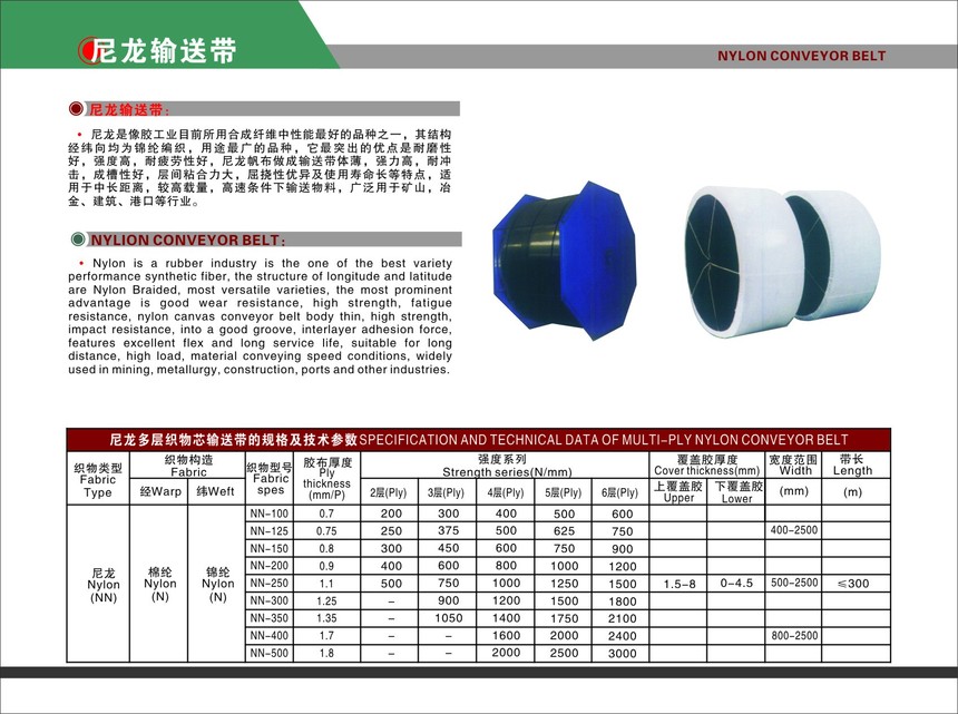 尼龙输送带具有带体薄、自重轻,弹性好,强力高、耐磨耐冲击,成槽性好,层间粘合力大,屈挠性优异及使用寿命长等特点。